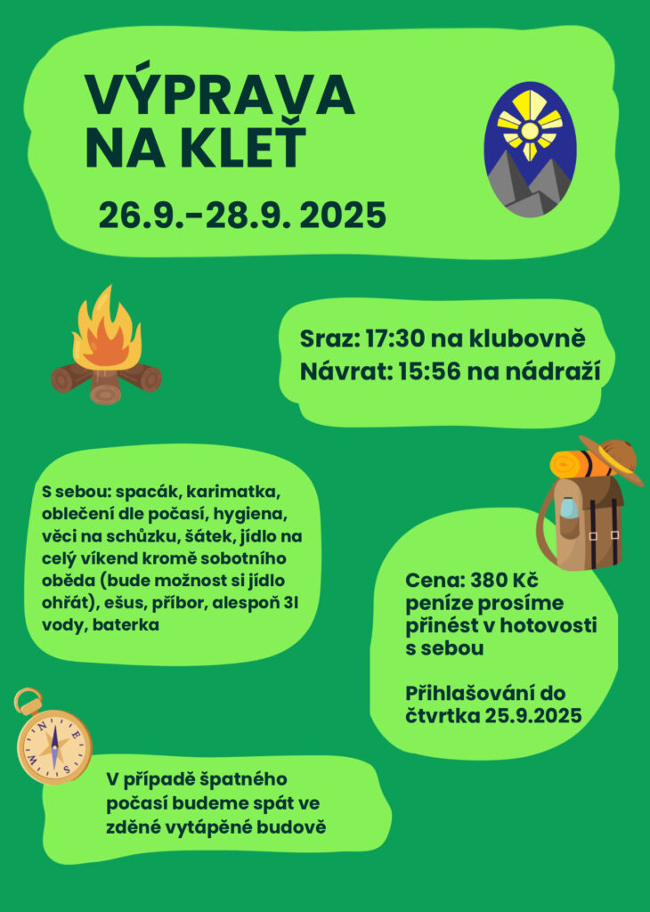 posíláme pozvánku na zářijovou výpravu skautů a skautek, která proběhne 26. až 28. září. Budeme se těšit na hojnou účast.